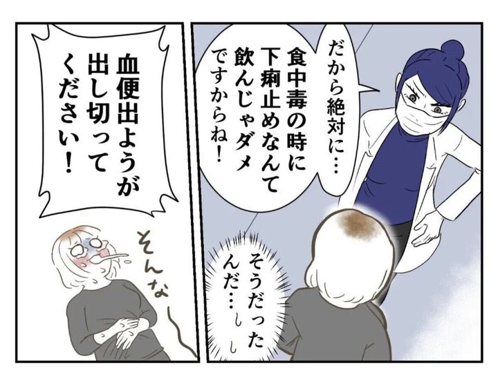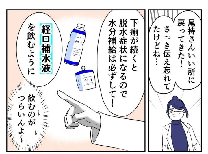 医師は、悪い菌を出し切るまで下痢止めなどは飲まずに、と言う指示を尾持トモさんにします。食中毒の場合は特に体の外に早く菌を出すことが大事なのですね。
