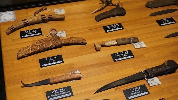 こちらは、『ゴールデンカムイ』でもおなじみの「マキリ」。皮をはぐ用、器の内側を彫るため用など、用途ごとにたくさんの種類があります。緻密に彫刻されたアイヌ文様が美しいッ…。