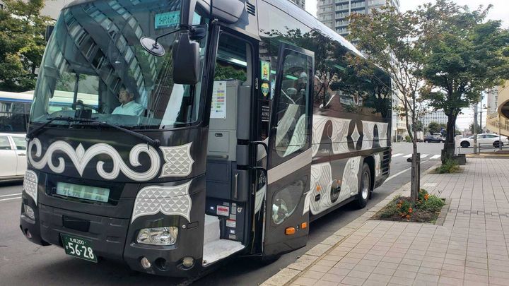 美しいアイヌ文様がデザインされたバスが待機しています…ッ!