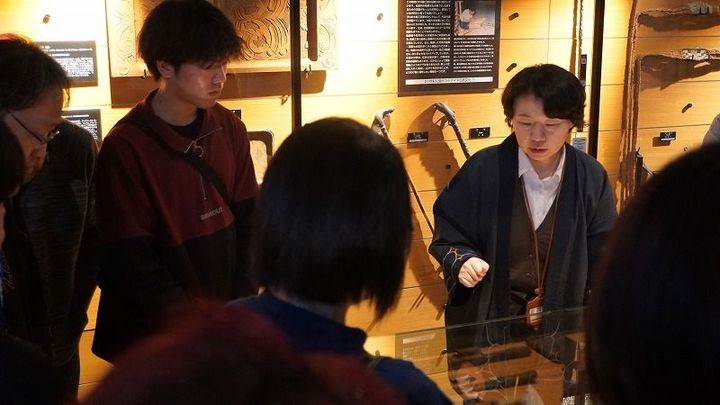 「人々の暮らし」「神々のロマン」「大地のめぐみ」「造形の伝承」の4つのゾーンから成る館内の見どころについて、解説をしてくれました!ツアー参加者の皆さんも、真剣な表情で話に聞き入っています。