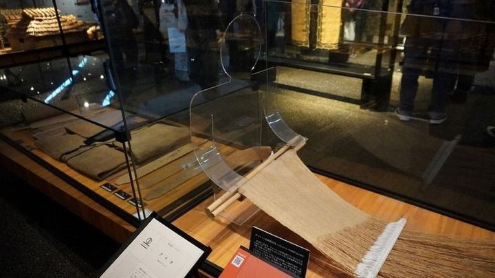 こちらは「アットゥㇱ」と呼ばれる、オヒョウなどの木の内皮の繊維を使った、アイヌの織物です。衣服や半纏、帯などの小物類等に使用されています。女性の手仕事として、受け継がれてきました。