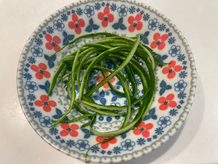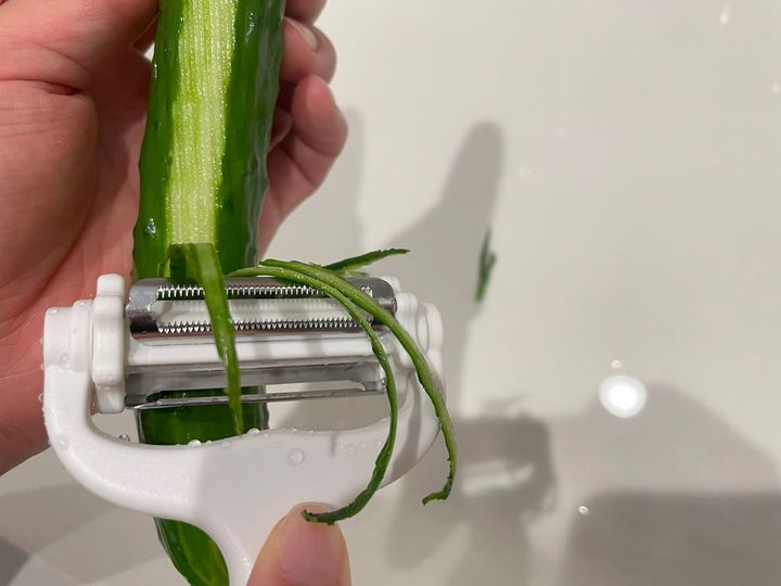 厚めの皮を剥くようにしっかりと力を入れてピーラーを動かすと、きゅうりがきれいな千切りに…!