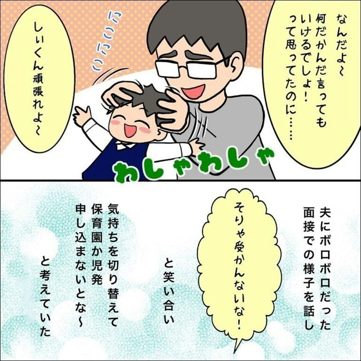 帰宅し、夫に面接での様子を話したふくふくさん。夫も心のどこかで行けるはずと期待していた部分があったようですが、面接での様子を聞くと受からなくて当たり前だと納得してくれたようです。