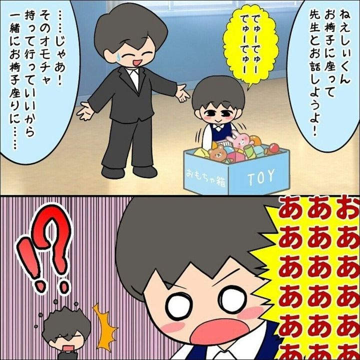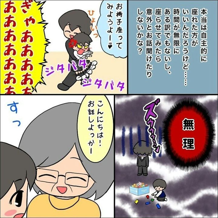幼稚園の面接に来たものの、園長先生と向かい合って座ることすらできず遊び始めてしまったしぃ君。ふくふくさんは声をかけたり無理やり座らせようとしてみますが、うまくいかず絶望的な気持ちに…。園長先生がしぃ君に質問をしても会話にならず、園長先生も困った顔になってしまいます。ある程度予想はしていても、まさかここまでとは園長先生も思っていなかったのかもしれませんね。