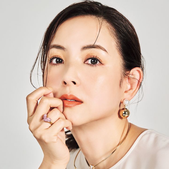 ブラウス¥20,000(バナナ・リパブリック)チョーカー¥6,480 ピアス¥8,800 リング¥4,200(すべてアビステ)