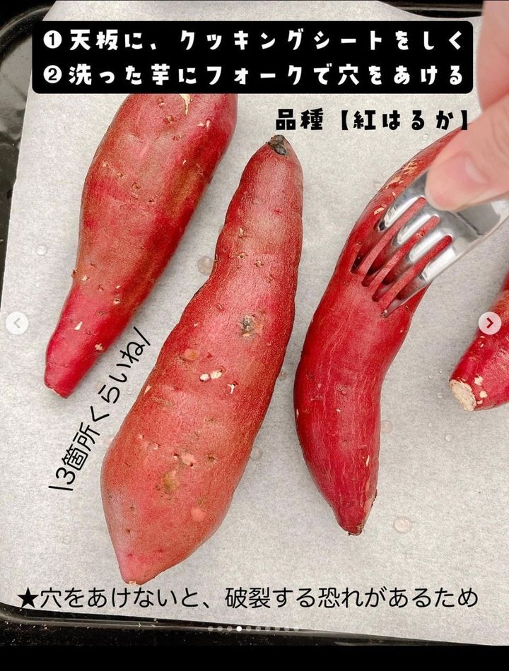 オーブン用の天板にクッキングシートをしく。洗った「さつまいも」を並べて、3か所くらいフォークで穴を開ける。理由はさつまいもが破裂するおそれがあるためです。