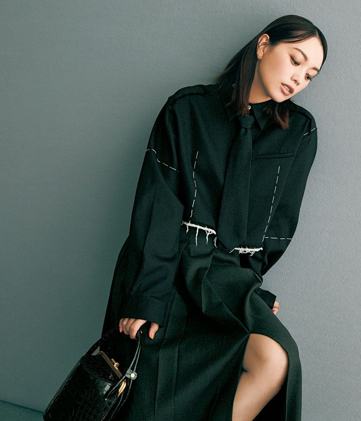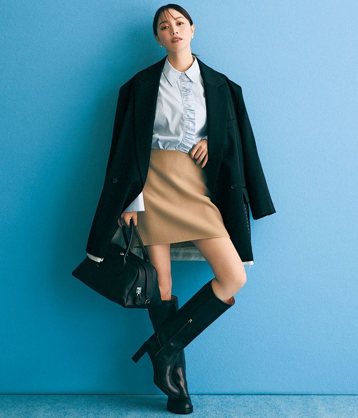 実はSTORY読者の「着てみたい」アイテムNo.1のミニスカ。ロングブーツやタイツが味方になる冬こそ、チャレンジしどき♡ パサッと羽織れるビッグシルエットの男前ジャケットで端正×女っぽいバランスを。