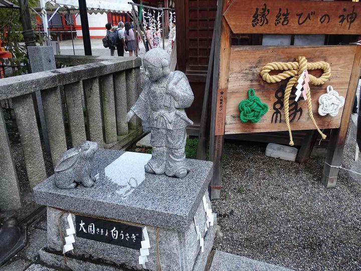 この神社が縁結びのご利益があるとされているのは、社務所の前にある「大国主社」に縁結びの神様とされる大国主神(おおくにぬしのかみ)が祀られているからです。大国主神はいわずと知れた縁結びの神様。鳥居横には、神話「因幡の白兎」に登場するウサギの像も!