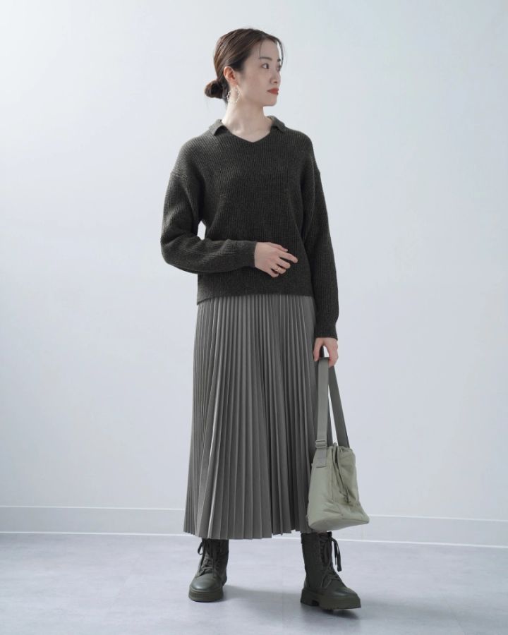 一見カジュアルな印象のブーツですが、大人っぽい雰囲気のきれいめコーデにもぴったりです。同じくユニクロの「ミックスヤーンポロセーター」と「プリーツロングスカート」を合わせると、デートから通勤まで幅広いシーンで使えるコーディネートに。この冬流行必至のオリーブカラーでまとめると、一気にトレンド感のあるスタイルに仕上がります。