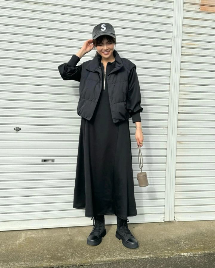 ワンピースを合わせ、ブラックでそろえたカジュアルコーデ。さらっとした印象のワンピースがレースアップブーツのさりげない華やかさを引き立てます♡ロングスカートとブーツで肌の露出を抑えたスタイルなら、寒さが厳しい時期でも暖かく過ごせますよ。