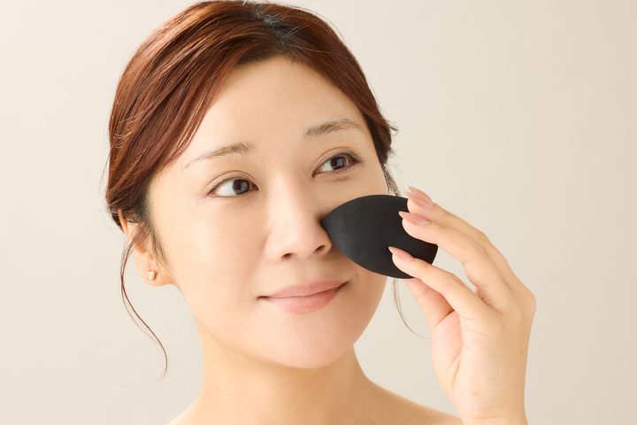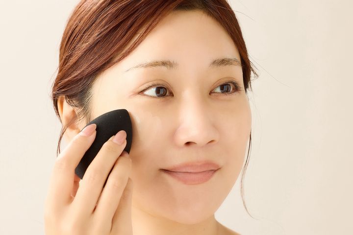 水に濡らして硬く絞ったスポンジを使います。ファンデーションを少量手に出し、スポンジにつけてから頬の高いところからトントンとのせて。頬の高いところにファンデーションがしっかりのることで、肌がキレイに見えるレフ板効果が。スポンジの水分とファンデーションが混ざって、水分が揮発する時にツヤがでます。