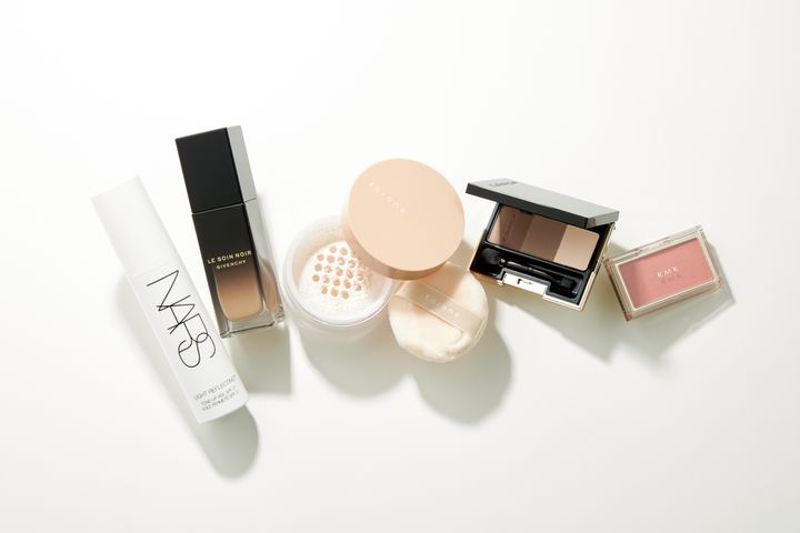 (左から)【下地】NARS ライトリフレクティング トーンアップヴェール 30ml ¥6,380/NARS JAPAN 【ファンデーション】ジバンシイ ソワン ノワール セラム ファンデーション 30ml 20 ¥17,980/パルファム ジバンシイ 【フェイスパウダー】ルミナスヴェール フェイスパウダー 02 ¥3,850/トーン 【シェーディング】3D コントロール アイブロウ 03 ¥7,150/SUQQU 【チーク】RMK ピュア コンプレクション ブラッシュ EX02 ¥3,630(限定品)/RMK Division