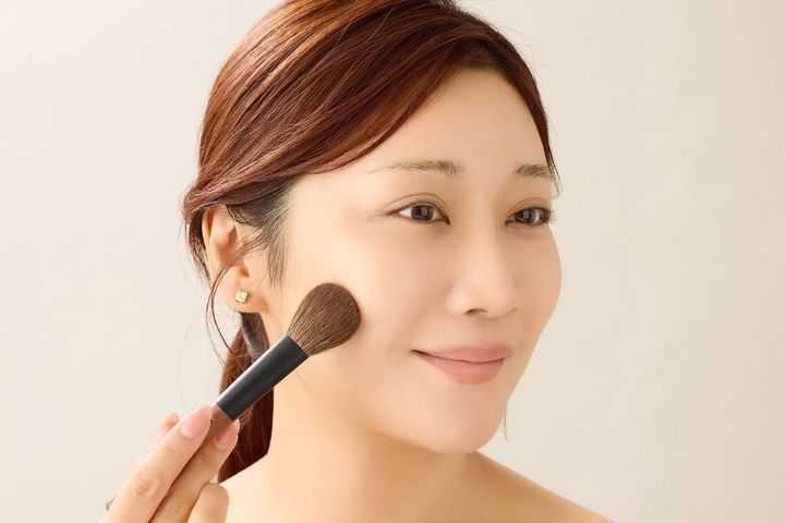 チークの赤い色は膨張色ということを利用して、40代が気になる窪みやへこみにのせると骨格のバランスをとることができます。また、両頬に渡すように鼻の上をまたぐ位置にチークを入れると明るさが出るので、秋冬の暗めカラーの洋服を着た時に顔映りが良くなります。