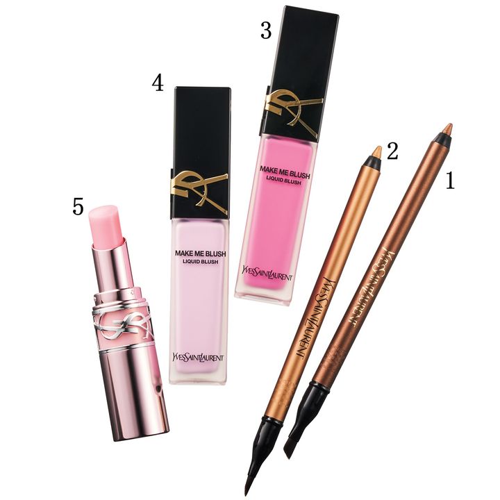 1・2 クリーミーな描き心地。シャイニーな質感を選んで軽やかに。YSL リべレイテッド アイライナー ウォータープルーフ 3、6 各¥4,620 3・4 意図せず頰を赤く染めたような血色感を実現。重ねてもシームレス。同 メイクミー ブラッシュ リキッド 66、69 各¥8,360 5 美容成分を高配合したとろける生バーム。同 ラブシャイン キャンディ グロウ バーム IB ¥4,950(イヴ・サンローラン・ボーテ)