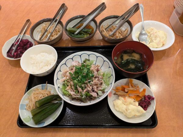 メインの茶美豚豚しゃぶに、ご飯・お味噌汁・お総菜5種のおかわりOKです。わかめの味噌汁!嬉しい。お総菜5種は、柴漬け・もやしナムル・オクラの煮浸し・きんぴら・ポテトサラダです。オクラともやしナムルがおいしくておかわりしました。