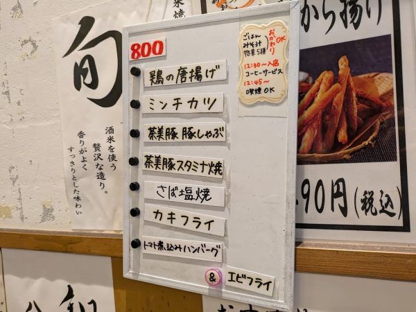 定食のメニューが、鶏の唐揚げ・ミンチカツ・茶美豚豚しゃぶ・茶美豚スタミナ焼・さば塩焼・カキフライ・トマト煮込みハンバーグ&エビフライの7種です。定食の種類が豊富ですね~。そして、ご飯・味噌汁・総菜5種のおかわりが出来ます。これはすごいサービスですね!そして、12時半を過ぎるとコーヒーのサービスがあります。お得ですね!