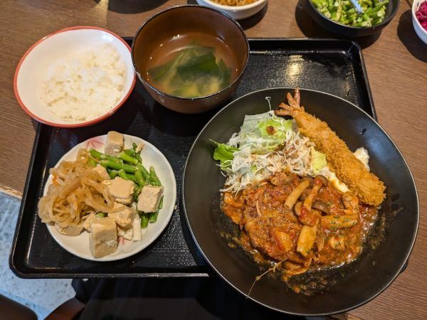メインのトマト煮込みハンバーグとエビフライに、もちろん、ご飯・お味噌汁・お総菜5種のおかわりOKに食後のコーヒー付きです。