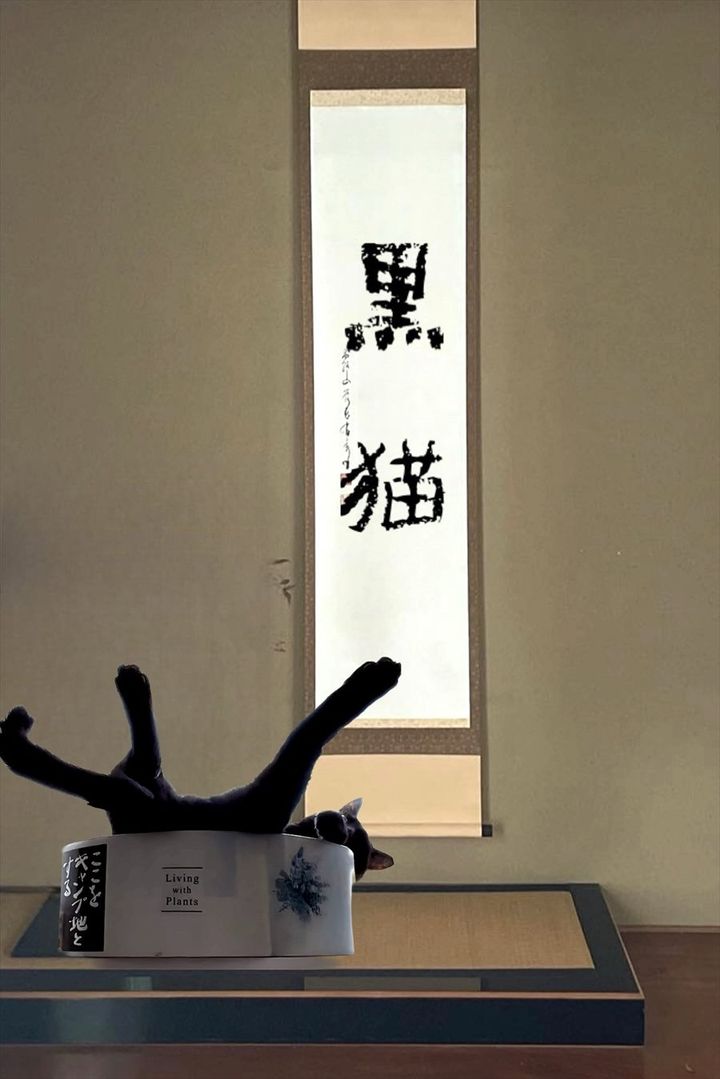 目に入るのは掛け軸に書かれた「黒猫」の文字。 そして、その手前には、黒猫の『殿』くんがあおむけになっているらしい姿。 この子は、4年前から一緒にいるそうです。