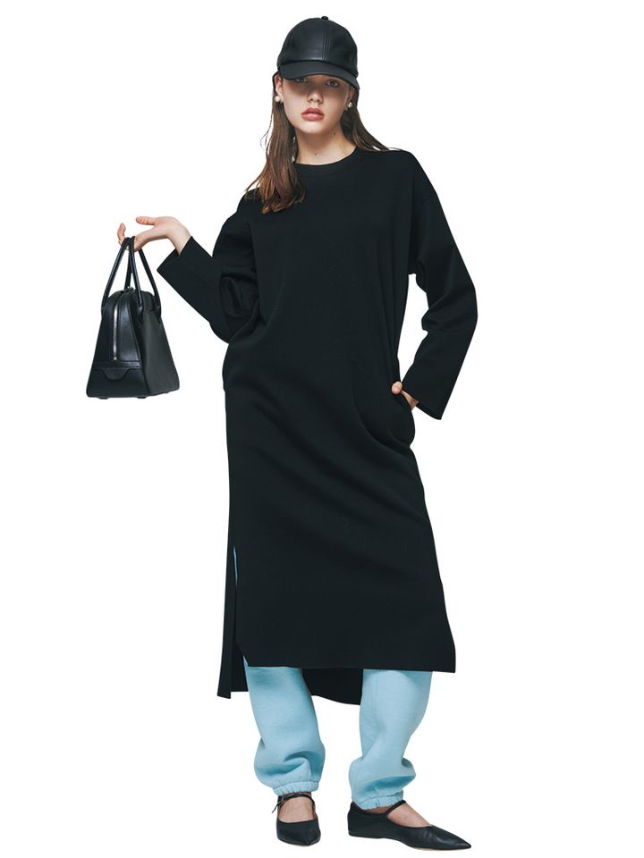 【POINT】水色を黒ワンピースの下からのぞかせて、ALL黒とのコントラストを強調。小物も黒のレザーで統一して、きりっと見えるようとことん辛口に。