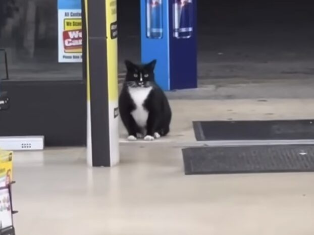 3. 閉店待ちをしている? 自動ドアのそばで待機する猫、ドアが閉まると