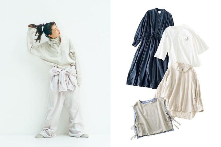 オーバーサイズのオールインワンは、イタリア製の柔らかなコットンフランネル生地を使用。ドライタッチのコットンで編み立てたオリジナル生地のラグビーシャツは、シーズンカラーで新鮮な印象。ボーイッシュなアイテム同士の組み合わせながら、ニュアンスのあるほんのりスモーキーな色味でまとめることで、やさしい表情に仕上がります。