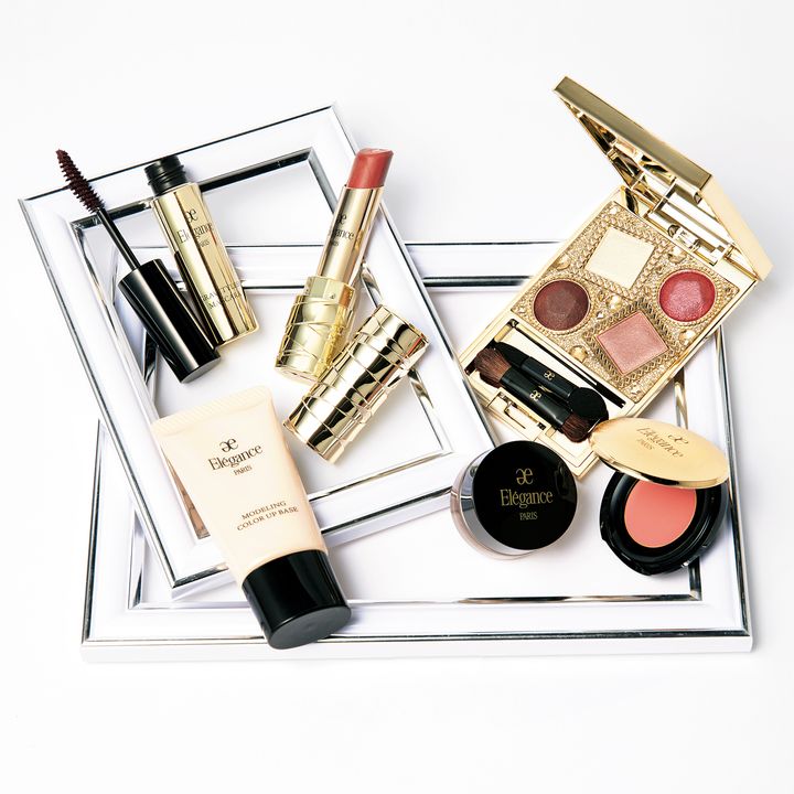 現品サイズのアイシャドウ、リップスティック、ミニサイズのジュレアイシャドウ、マスカラ、チークは限定カラー。下地は人気色のミニサイズがセット。落ち着きのある赤みを主役にした、品格あふれるメイクがこのコフレ1つで完成! コフレ パルピタン ¥8,800(エレガンス・コスメティックス)