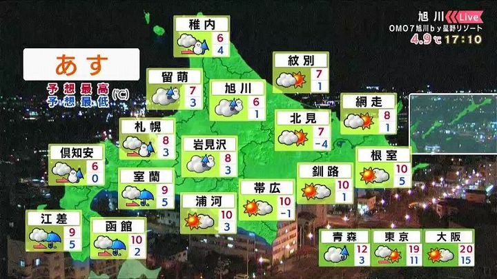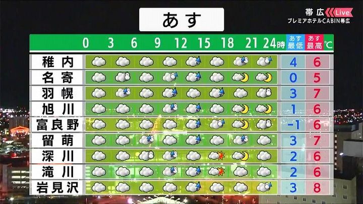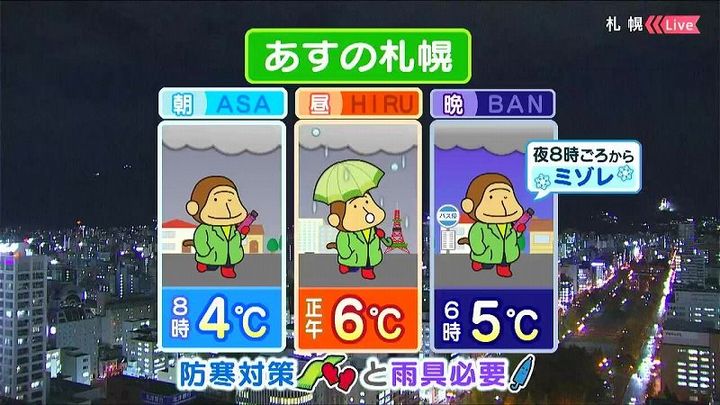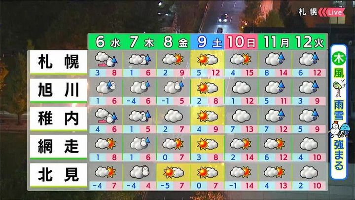 背景は5日午後5時10分ごろの旭川情報カメラ。6日もストーブが欠かせないような寒さになりそうです。この時期は特に、暖房の消し忘れに気を付けて下さい。旭川では6日も傘が必要です。