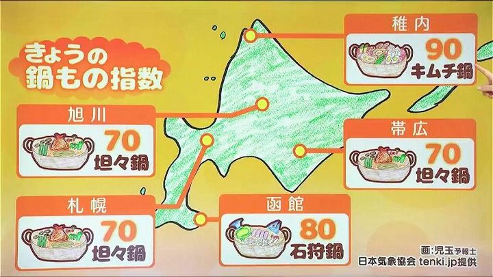 稚内は90、ピリッと辛いキムチ鍋です。函館も結構冷えるので80の石狩鍋。札幌や旭川、帯広は70の担々鍋がオススメです。