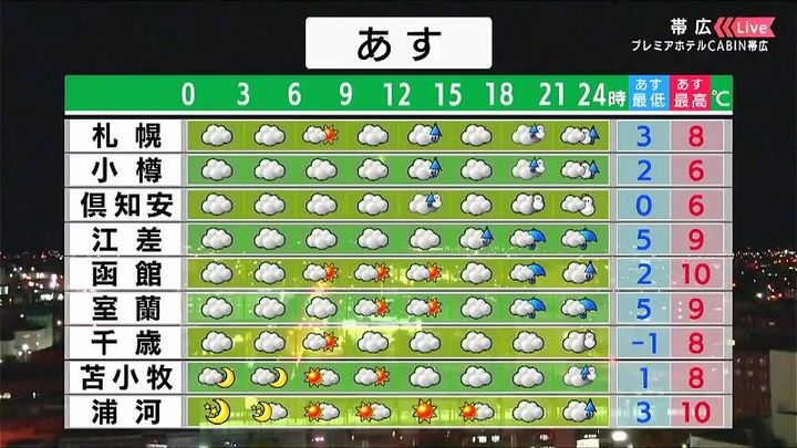 浦河で晴れるほかは雲が広がり、札幌周辺で昼頃から、そのほかも夜は雨や雪が降るでしょう。夜は倶知安周辺でうっすら積もるおそれがあります。