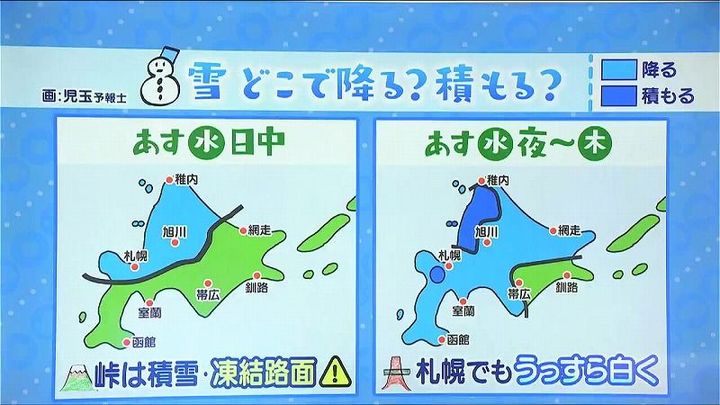 6日の夜から木曜日にかけては雪の降るエリアが広がり、函館や室蘭でも初雪の可能性があります。幌加内町周辺や留萌、空知地方、倶知安町周辺では積雪状態となり、少し雪かきも必要になりそうです。