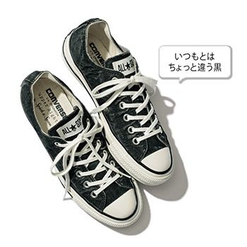 デニムスニーカー(別注)/スピック&スパン(スピック&スパン ルミネ有楽町店) アッパーに「upper hights」の黒デニムを採用。ウォッシュ加工をほどこし、特有の色落ちやあたりを効かせたエイジング感漂う黒デニム。コンバースの名作「ALL STAR US」のローカットモデルに使用し、趣のあるカジュアルへ。