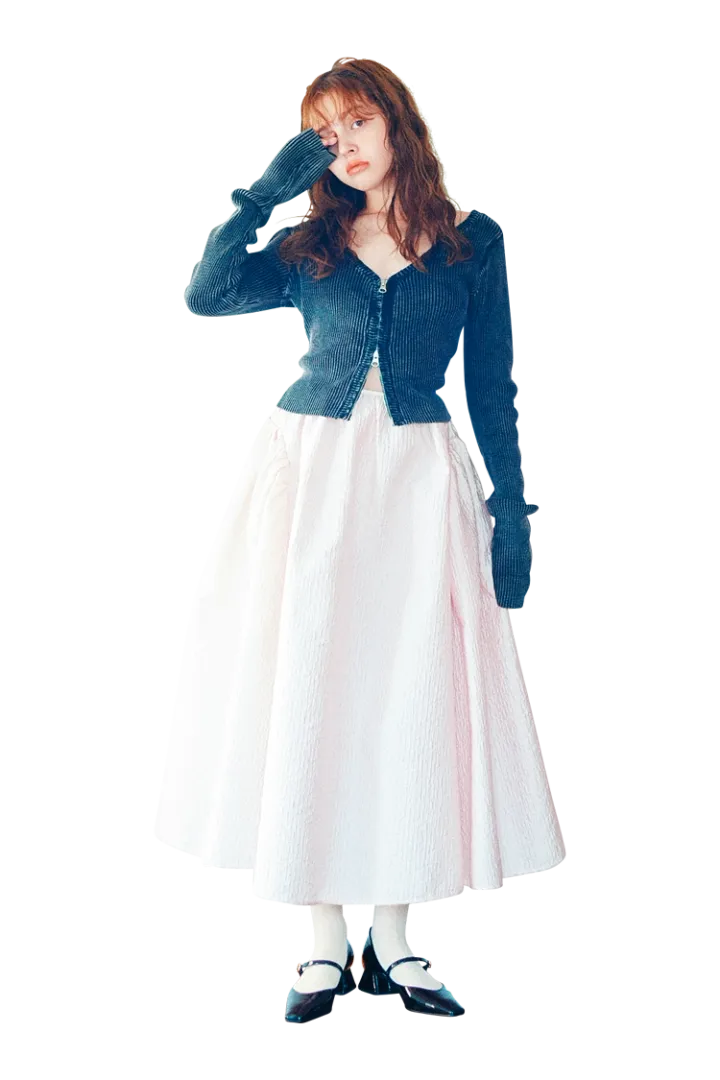 ピンクボリュームジャカードスカート 18,700円/The Girls Society ダブルファスナーリブニット 6,990円/GYDA ルミネエスト新宿店 ハイソックス 880円/靴下屋(Tabio)パンプス 7,900円/チャールズ&キース(チャールズ&キース ジャパン)