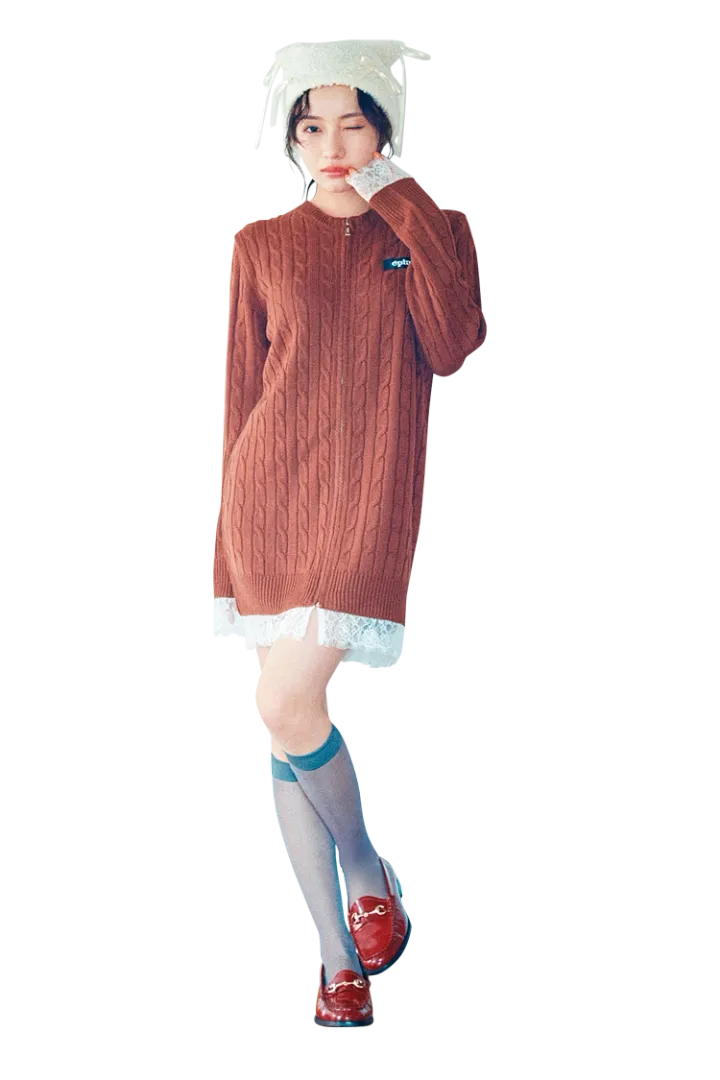 アイボリーリボンつきネコ耳ニットキャップ 3,289円/スピンズ ブラウンニットワンピース 12,880円/épine ハイソックス 1,210円/靴下屋(Tabio)ローファー 29,700円/ダイアナ(ダイアナ 銀座本店)