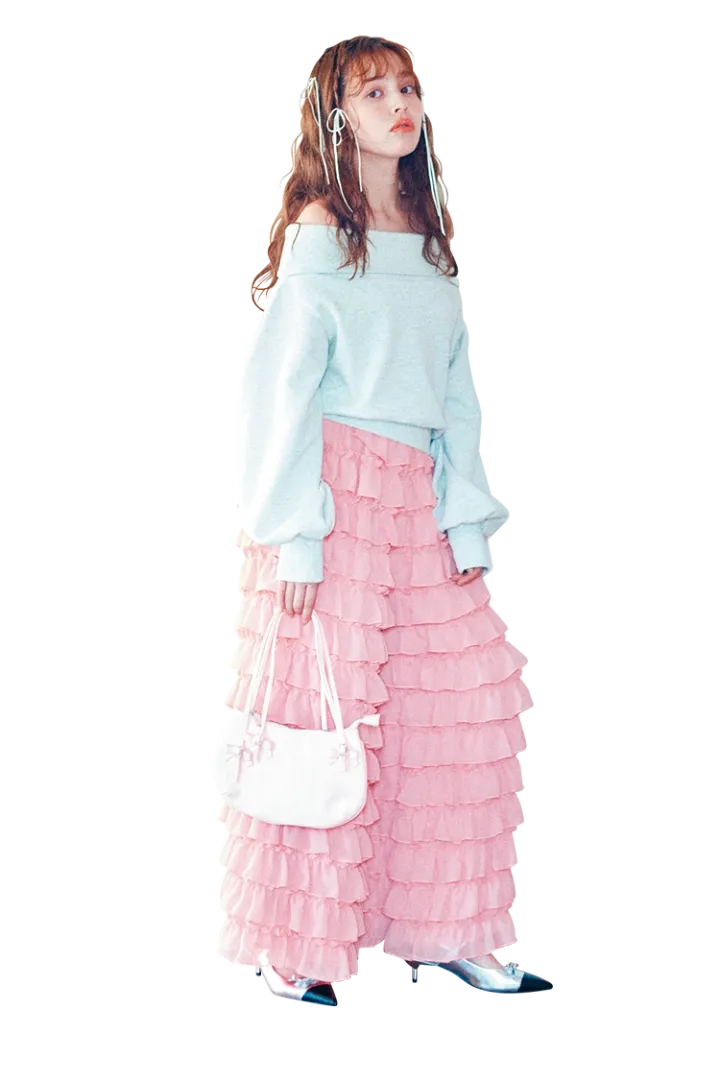 シフォンティアードパンツ 29,700円/カロリナ グレイザー(ビームス公式オンラインショップ)オフショルスエット 6,300円/dazzlin バッグ 4,190円/NADIA FLORES EN EL CORAZON パンㇷ゚ス 9,900円/チャールズ&キース(チャールズ&キース ジャパン)ヘアリボン/スタイリスト私物