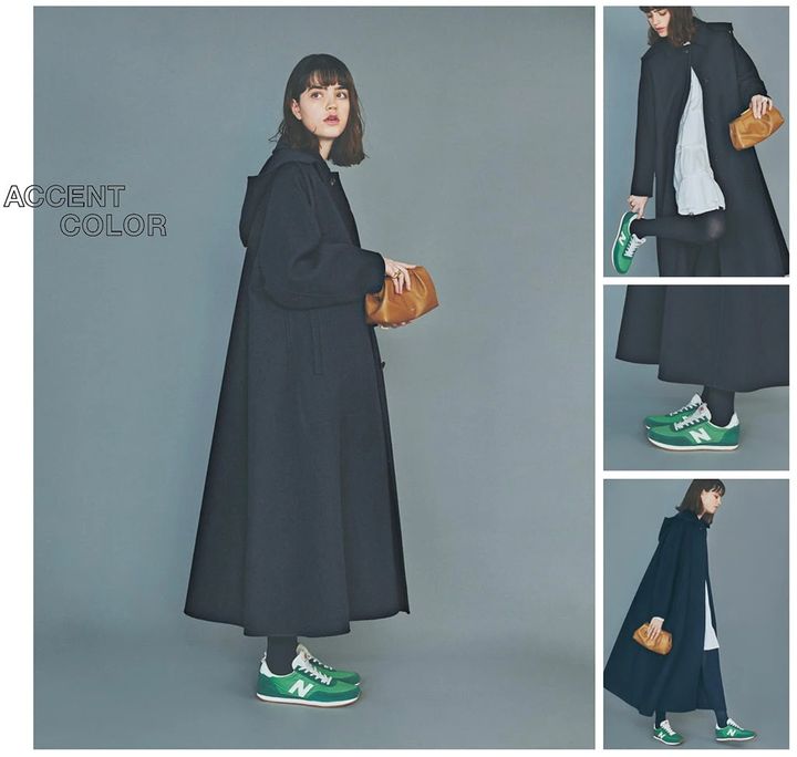 「ある意味スタイリングいらずともいえる、全身を包み込むオーバーサイズのロングコート。スニーカーと相性がいいのは、ヒザ上より短めのボトムか、長い羽織りアイテム。タイツの色みもそろえ、色もフォルムも重いトーンに徹すればだいたいのスニーカーはバランスよく仕上がります」(樋口さん)