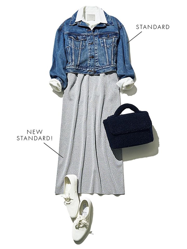 デニムジャケット/リーバイス®(リーバイ・ストラウス ジャパン) 白シャツ&シルバーラメIラインスカートセット/UNFILO ネイビーボアバッグ/TSURU By MARIKO OIKAWA 白スエードスニーカー/VANS(VANS JAPANカスタマーサポート) デニムジャケットは前を閉めて着ることで、シャツのように洗練された印象へ。