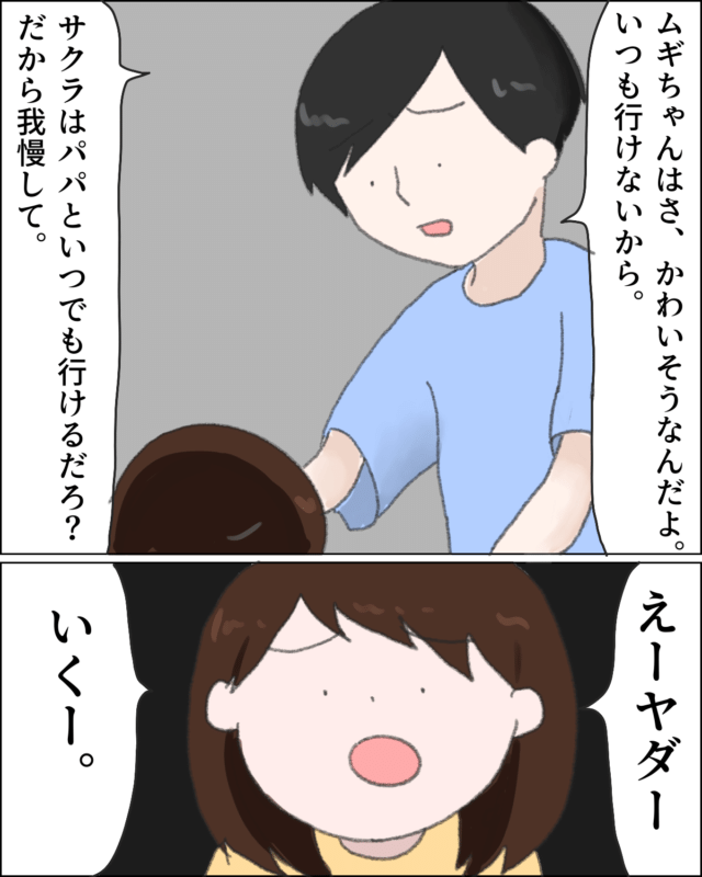 ムギちゃんとファミレスに行くと言って出かけるパパに当然「私も行く」と嬉しそうに言ったユリに「いつでもいっしょに行けるから我慢して」と言う夫。ムギちゃんはいつも行けないからかわいそうだと言うのです。5歳のユリが納得するはずもなく、「ヤダー。いくー。」と泣きそうになって言いました。