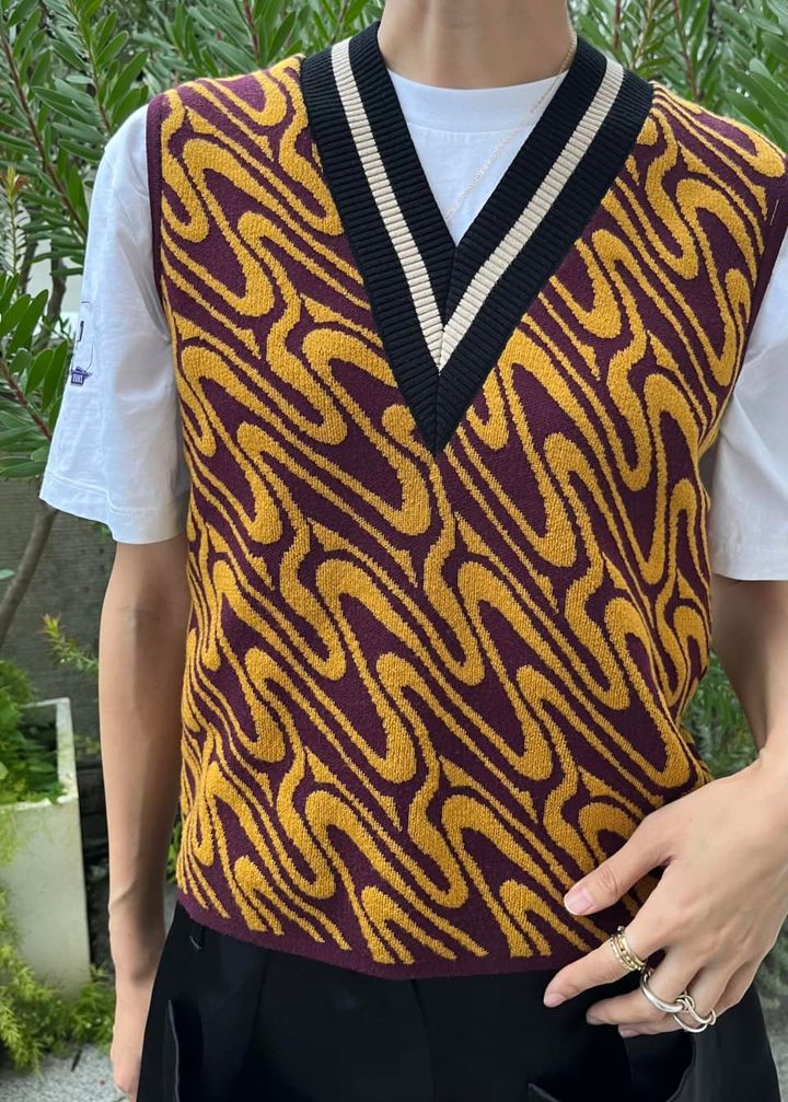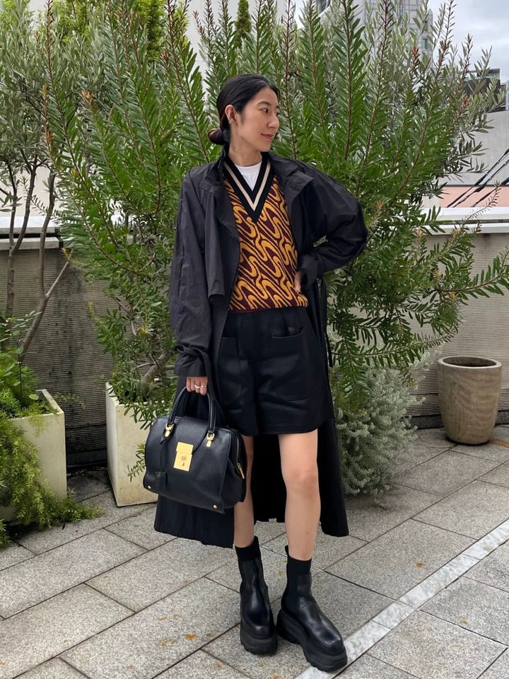 「ニットベストは他にないユニークな柄なので、1枚で着たり、レイヤードしたりしてスタイリングしています。また寒暖差がある季節なので、ライトコートを羽織って調節しています」ドリス ヴァン ノッテンのニットベストは本人私物