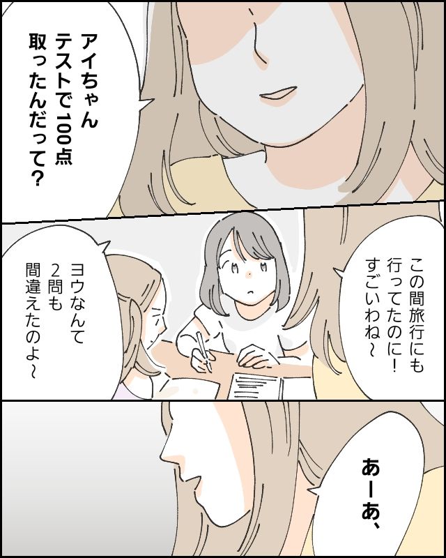 ある日「アイちゃん、テストで100点取ったんだって?この間旅行にも行ってたのに!すごいわね~。ヨウなんて2問も間違えたのよ~」ヨウちゃんのママはそう言った後で「あーあ、」とため息をつきました。