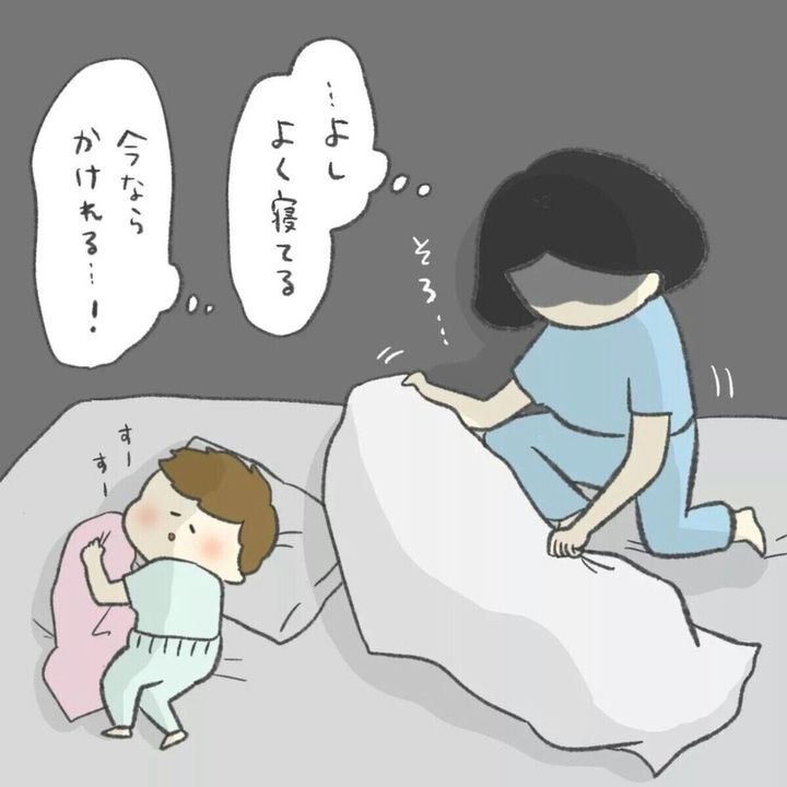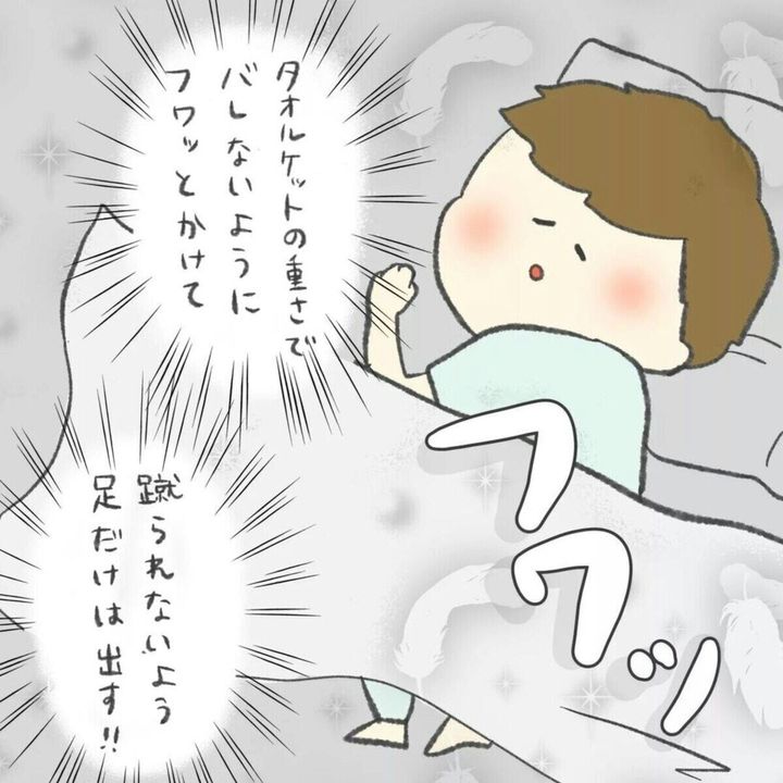 いつも寝ているうちに、タオルケットをはいでしまう息子。熟睡している息子を見て、今ならいけると思ったわさびさん。静かに息子に近づき、重さでバレないようにフワッとタオルケットをかけることに…。足まで覆ってしまうと蹴られるため、足は出すという徹底ぶりです。