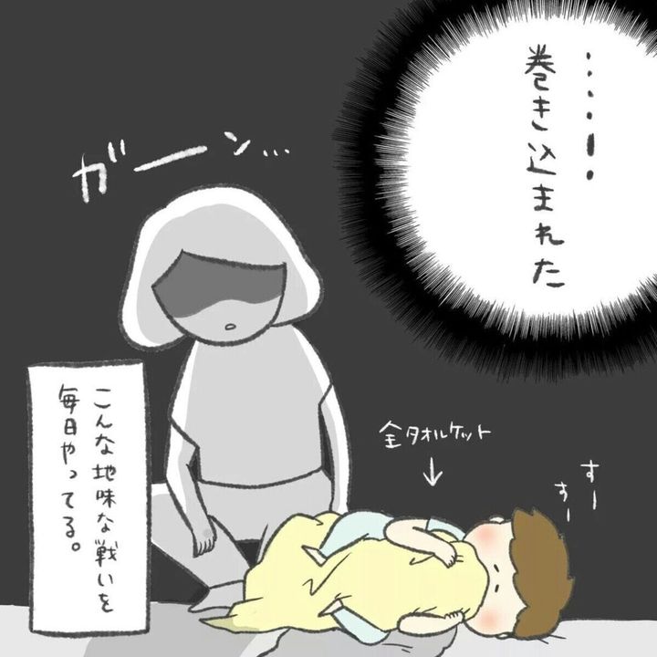 子どものあまりに活動的な寝相に驚いた経験は、子育て中の方ならきっとあるはず…。今回、ご紹介するのはわさび(@wasabi_2910)さんと息子の毎日続く「戦い」の様子を描いたエピソードです。息子が寝た後、そっとタオルケットをかけたわさびさん。ふわっとかけて、足は出しておく作戦でいくことにしますが、作戦は思わぬ方向へ…。最後の1コマがクスッと笑え、きっと温かい気持ちになるはず。ダイジェストでごらんください。