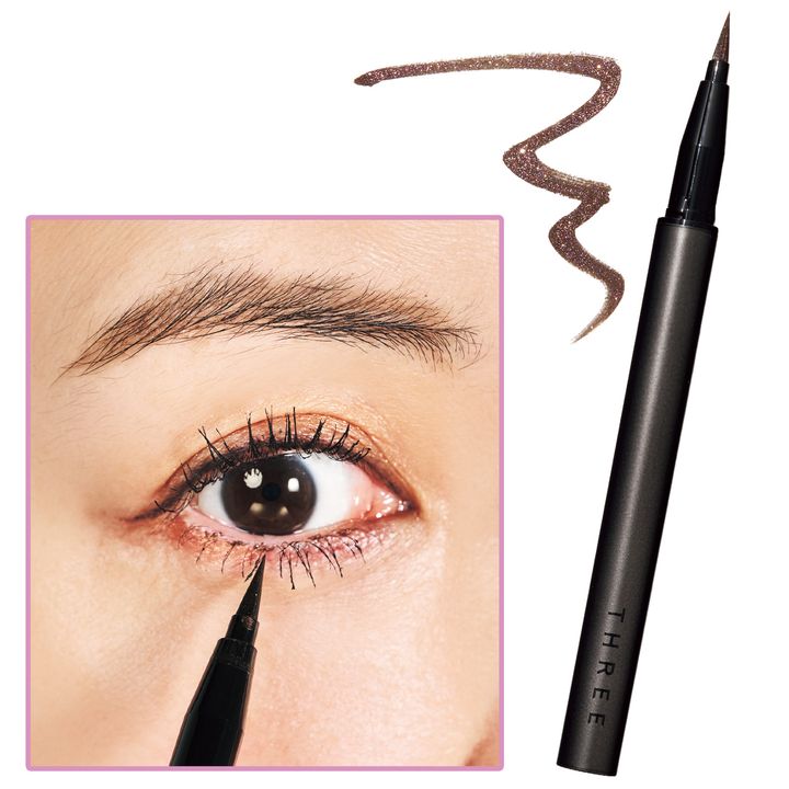 メタリックなツヤめきで、目元にさりげなく上質なきらめきを纏い、奥行きと深みを演出。THREE ファントゥファンキーリキッドアイライナー 03 ¥3,300(THREE)