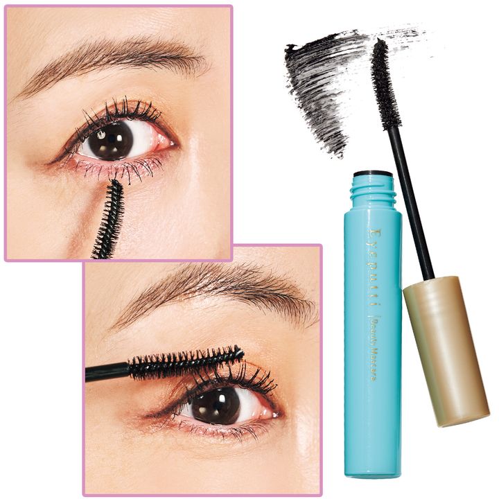 マスカラは、まつ毛1本1本をしっかり捉えてくれる極細タイプをセレクト。上にぐんぐん伸ばすように塗布することで、はれぼったさを緩和。下まつ毛はブラシの先端を使い、細かく下に向かって塗布すると綺麗な仕上がりに。