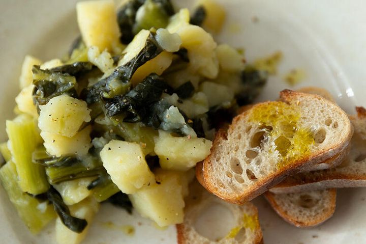 小松菜&じゃがいもという素朴な組み合わせも、白ワイン、オイル、にんにくのマジックで欧風テイストに。バゲットがよく似合います。料理研究家のワタナベマキさんに大好きな食材とそれを使ったレシピを教えてもらいました。