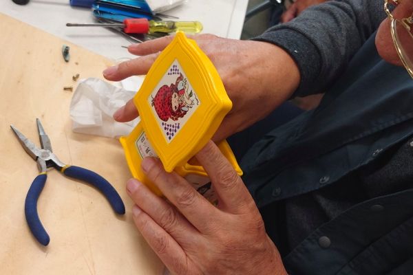 修理ではどんなことを心がけているか質問しましたら、「おもちゃは子どもが使うので、口に入れてしまうことがあるので刺激の少ない接着剤や先がとがっていないおもちゃ用のねじを使うようにしている」とのことでした。