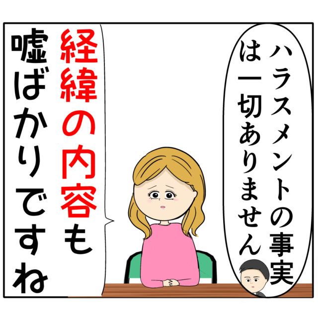 「ハラスメントの事実は一切ありません」良し男さんがきっぱり否定すると、「経緯の内容も嘘ばかりですね」と反論するふり子さん。
