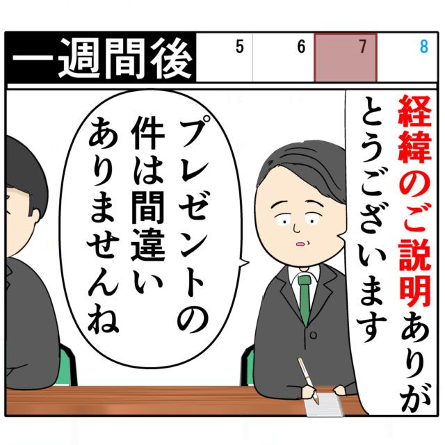 最初の面談から一週間後。二度目の面談が行われ、良し男さんはふり子さんにピアスをプレゼントした経緯を話しました。「経緯のご説明ありがとうございます。プレゼントの件は間違いありませんね」と確認する課長。