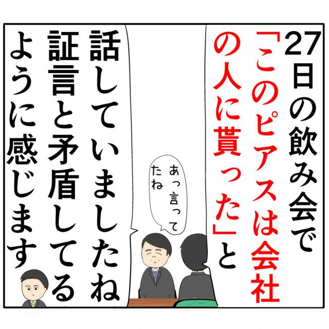 「27日の飲み会で『このピアスは会社の人に貰った』と話していましたね。証言と矛盾してるように感じます」ふり子さんの主張に対し良し男さんも反論します。前回の面談時に、飲み会の時につけていたのは良し男さんからプレゼントされたものではなく、前からお気に入りだったよく似たデザインの別のものだと話していたふり子さん。飲み会の席では「会社の人に貰った」と言っており、この矛盾を良し男さんが指摘しました。