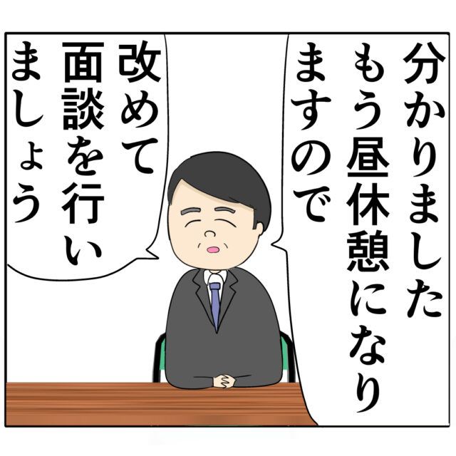 ピアスについて良し男さんとふり子さんのやり取りを聞いていた部長は「分かりました。もう昼休憩になりますので改めて面談を行いましょう」と言いました。