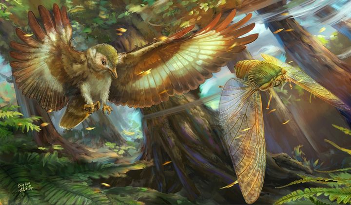 鳥から逃げるムカシゼミのイメージ図 / Credit: Edmund A. Jarzembowski et al., Science Advances(2024)